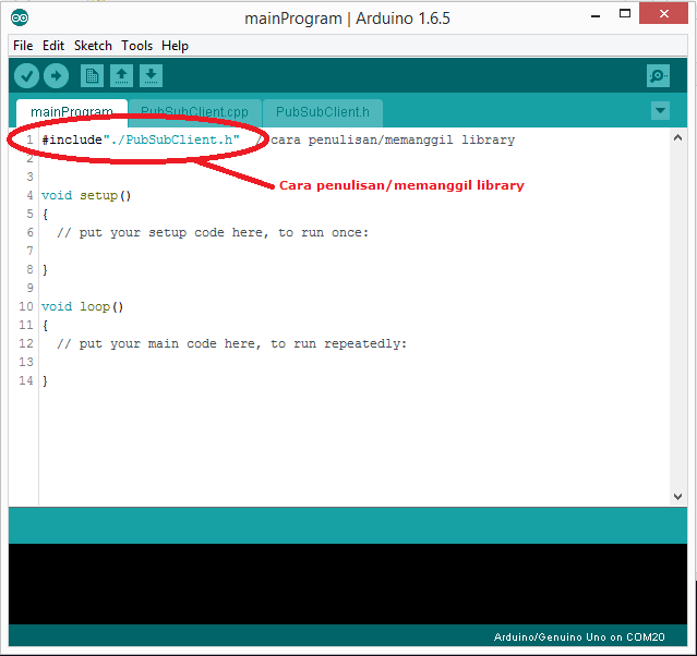 - Terdapat 2 folder "PubSubClientDefault" dan "PubSubClientJoint", pilih folder "PubSubClientJoint" dan untuk memprogram cukup edit bagian mainProgram.ino seperti pada gambar di bawah.